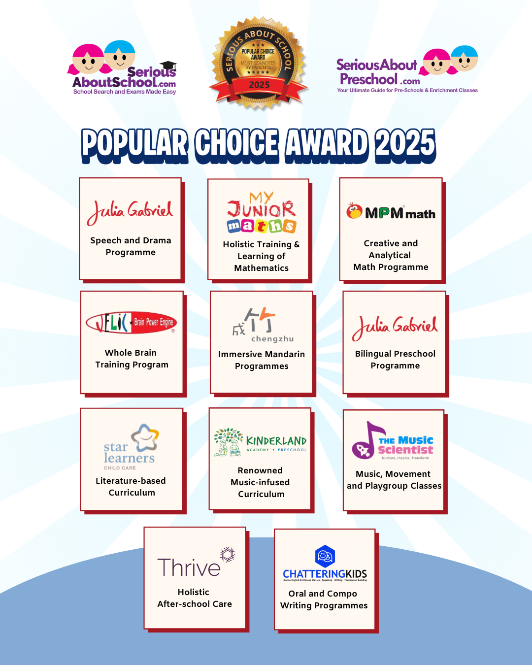 Which schools and enrichment centres have stood out the most this year? Explore our Popular Choice Award 2025 to see the top names that parents have been searching and inquiring about on www.SeriousAboutSchool.com.